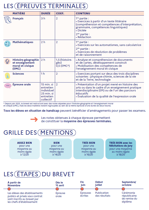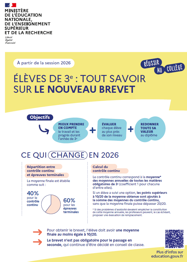 Le diplôme national du brevet évalue les connaissances et les compétences acquises à la fin du collège. Délivré par un jury, l'attribution du brevet ne conditionne pas l'accès à une classe supérieure en fin de troisième. À compter de la session 2026, les modalités d’attribution du diplôme national du brevet (DNB) évoluent.