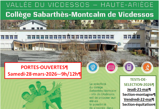 Les équipes du collège Sabarthès-Montcalm et de l'internat de la communauté de communes de Haute-Ariège vous accueillent le samedi 28 mars 2026 de 9h à 12h pour la journée portes ouvertes du site de Vicdessos : présentation du collège, des sections et de l'internat d'Excellence.
