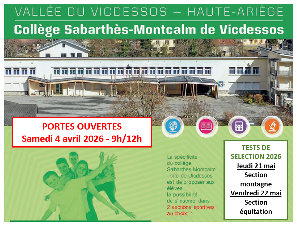 Les équipes du collège Sabarthès-Montcalm et de l'internat de la communauté de communes de Haute-Ariège vous accueillent le samedi 4 avril 2026 de 9h à 12h pour la journée portes ouvertes du site de Vicdessos : présentation du collège, des sections et de l'internat d'Excellence.